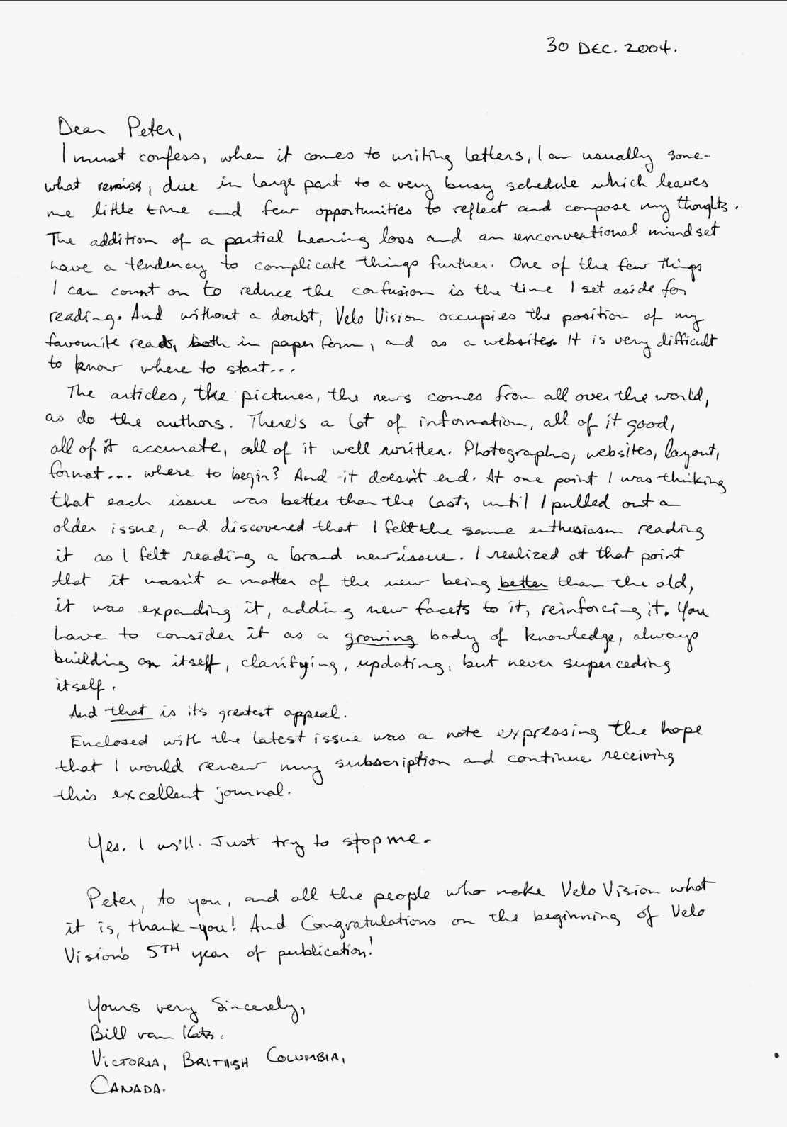- Dear Peter and staff at Velo Vision, many thanks for the latest issue. I was in hospital when it arrived... [gory medical details omitted! -Ed]....I wasn't feeling at my best. But the magazine cheered me up...please find cheque enclosed for further issues. Getting the magazine in hospital maybe didn't save my life but I think it saved my sanity!